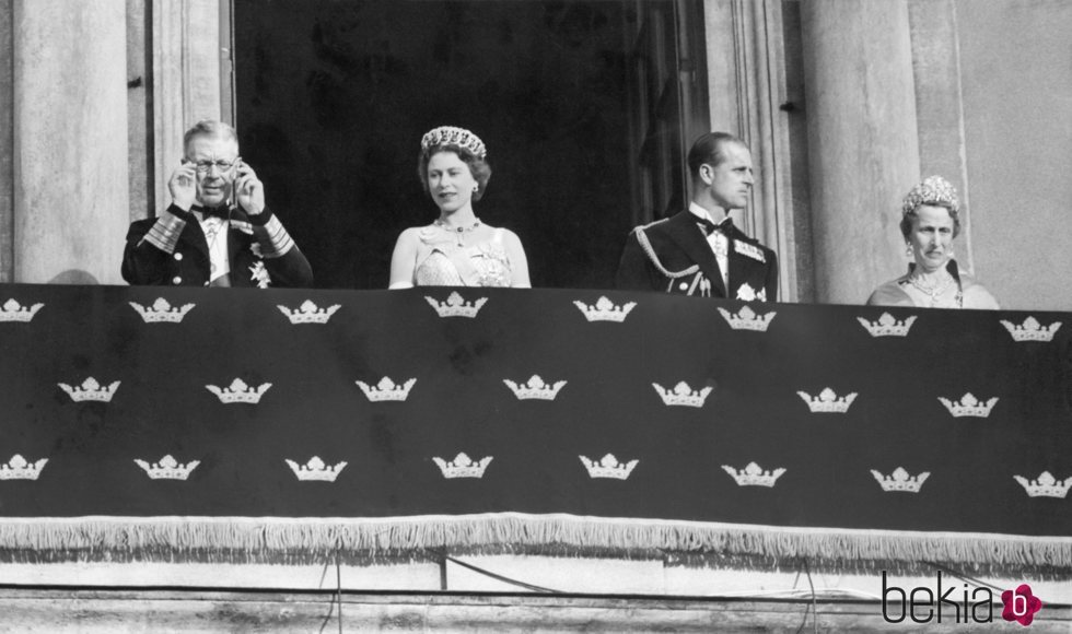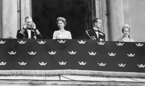 La Reina Isabel y el Duque de Edimburgo con sus tíos, el Rey Gustavo VI Adolfo y la Reina Luisa de Suecia en su Visita de Estado a Suecia en junio de 1956.