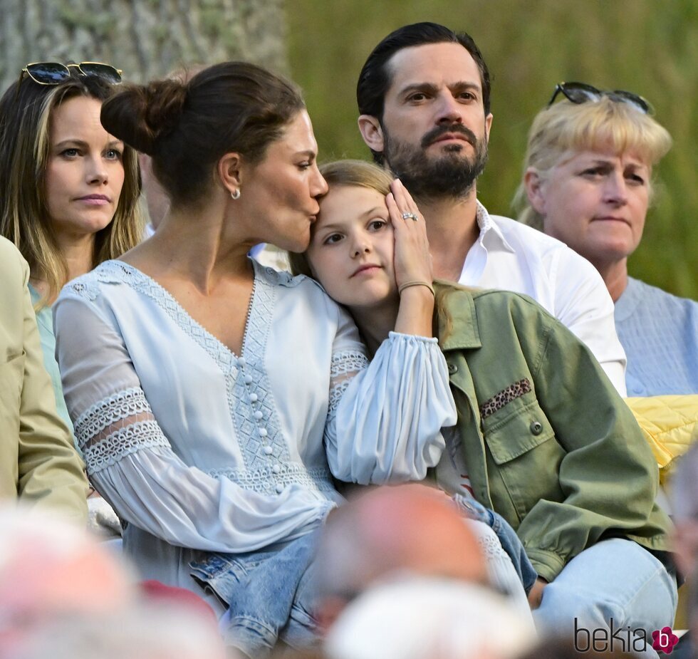 La Princesa Victoria de Suecia da un beso a la Princesa Estelle de Suecia en un concierto de Solliden Sessions durante sus vacaciones en Solliden.