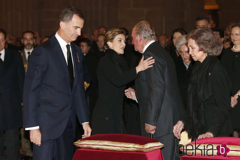 Los Reyes de España saludan a los Reyes Eméritos en el funeral del Duque de Calabria en El Escorial.