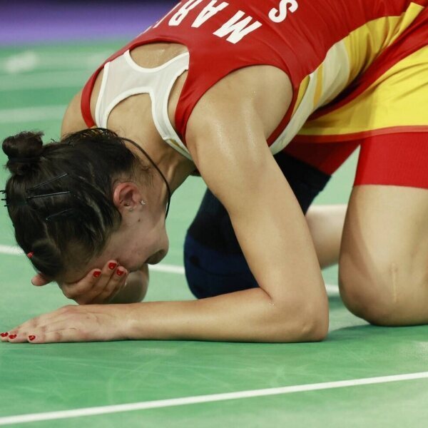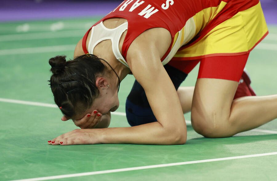 La deportista Carolina Marín se derrumba tras lesionarse y tener que abandonar en la semifinales de bádminton en los Juegos Olímpicos de París 2024.