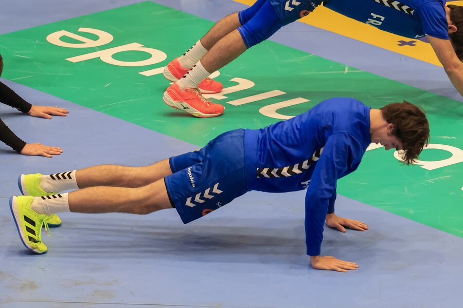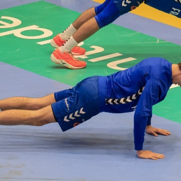 El jugador de balonmano Pablo Urdangarin haciendo flexiones en un partido de balonmano de la Copa de España entre el Barça y el BM Granollers en Irun.