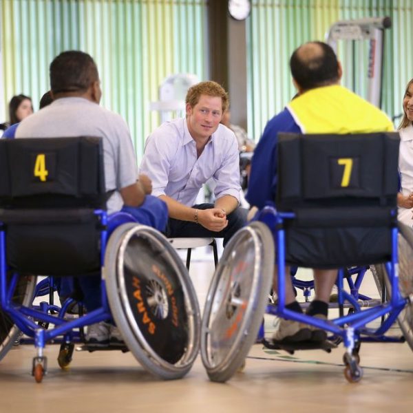 El Príncipe Harry de Inglaterra conversando con unos pacientes durante su visita al Hospital Sarah Kubistchek de Brasilia
