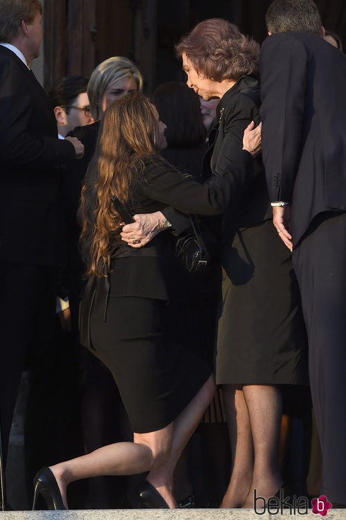 La Princesa viuda de Tírnovo hace la genuflexión a la Reina Sofía en el funeral del Príncipe Kardam de Bulgaria en la Iglesia de Los Jerónimos de Madrid.