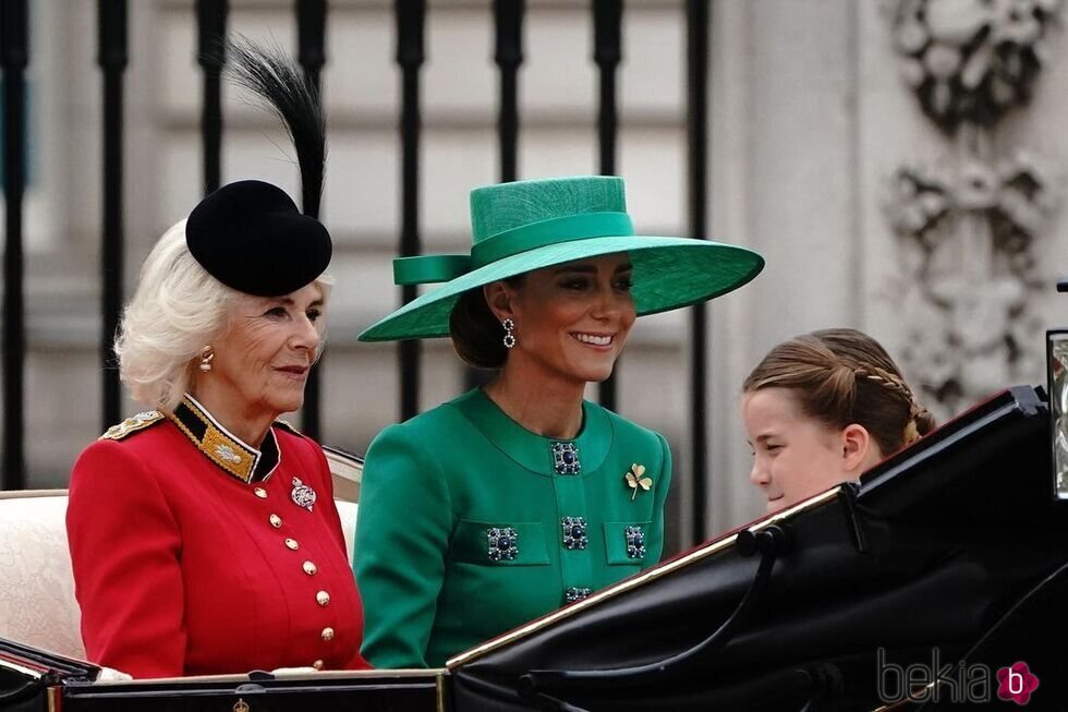 La Reina Camilla, Kate Middleton y la Princesa Charlotte saliendo del Buckinham Palace durante la celebración del Trooping the Colour 2023, el primero de actual Monarca desde que está en el trono.