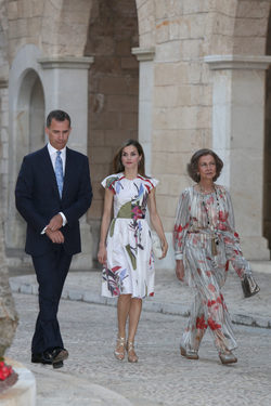 Los Reyes Felipe y Leizia y la Reina Sofía a su llegada a la recepción de las autoridades y los representantes de la sociedad en el Palacio de la Almudaina de Mallorca