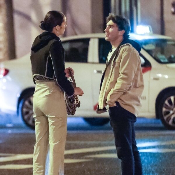 Victoria Federica de Marichalar y el piloto de motociclismo Albert Arenas hablando en un paseo nocturno en Madrid.