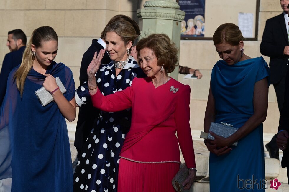 La Reina Sofía, la Infanta Elena, la Infanta Cristina y su hija Irene Urdangarin en la boda de Theodora de Grecia y Matthew Kumar en la Catedral Metropolitana de Atenas.