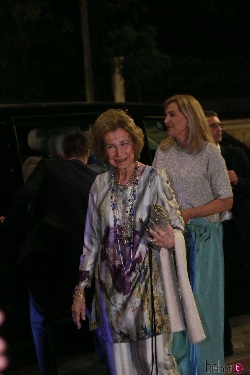 La Reina Sofía llega muy sonriente a la cena privada celebrada el día anterior a la boda de Theodora de Grecia