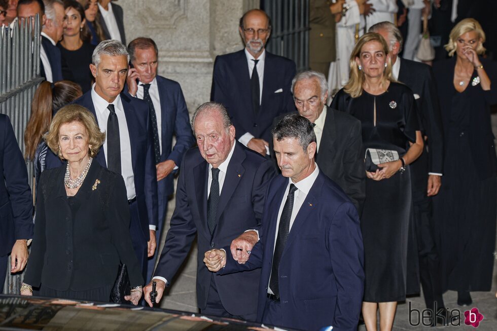 Los Reyes Juan Carlos y Sofía, José Miguel Fernández-Sastrón, Carlos Zurita, la Infanta Cristina y María Zurita saliendo de la Catedral Castrense de Madrid tras la misa funeral de Juan Gómez-Acebo.