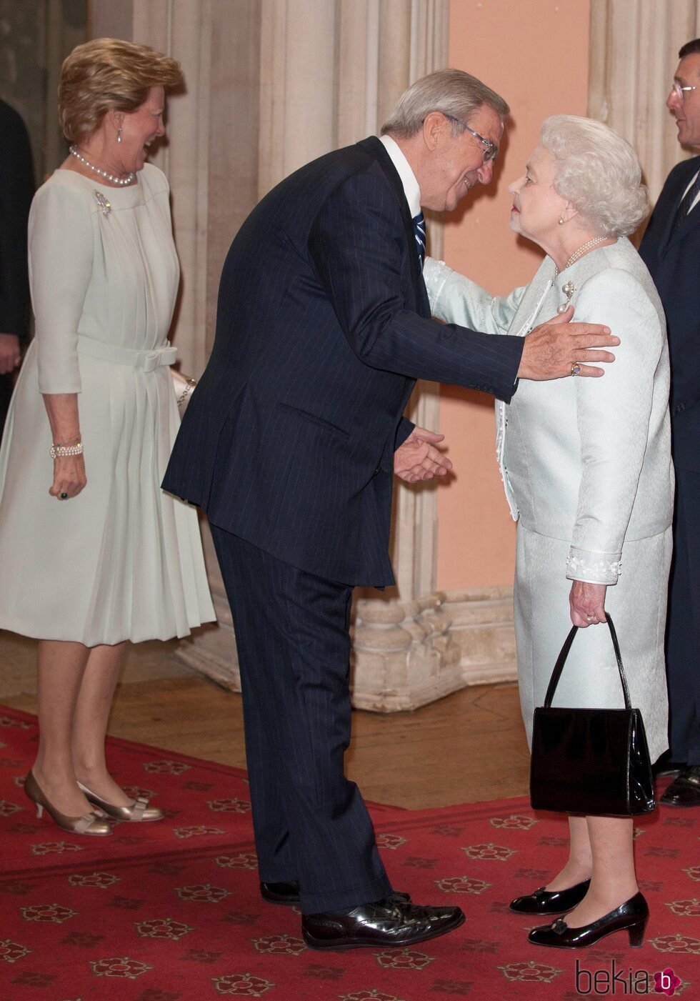 El Rey Constantino de Grecia y la Reina Isabel se dan un beso en presencia de la Reina Ana María de Grecia en el almuerzo por el Jubileo de Diamante de la Reina Isabel en 2012.