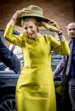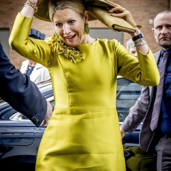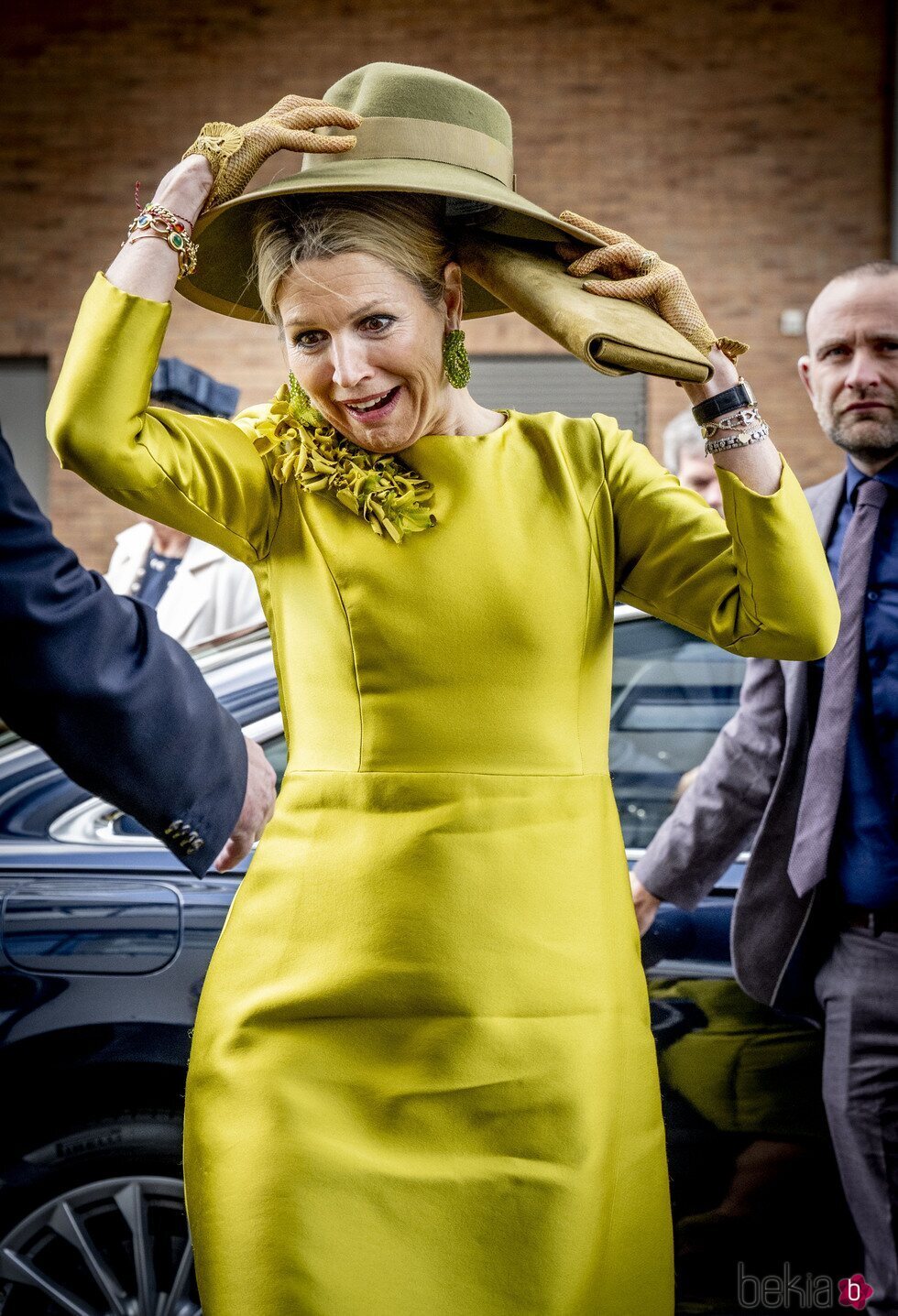 Máxima de Holanda es fotografiada sujetando su sombrero ante una repentina racha de viento que le ha jugado una mala pasada.