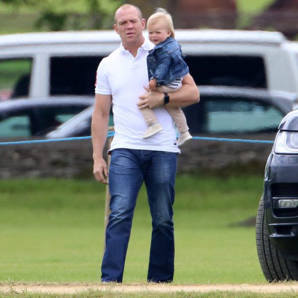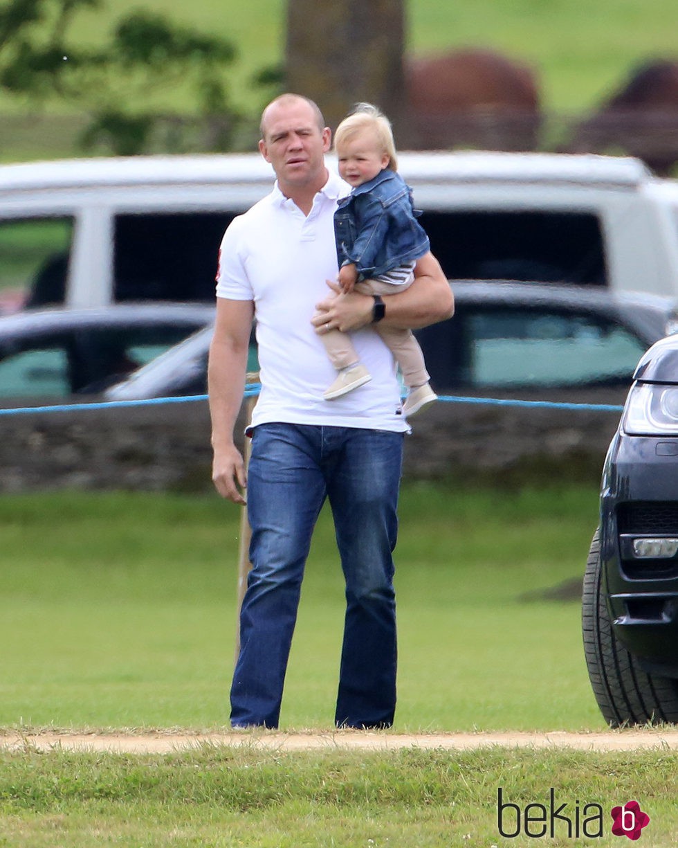 Mike Tindall con su hija Mia en brazos durante una jornada de polo