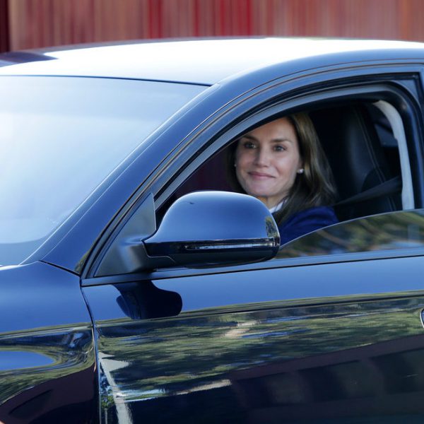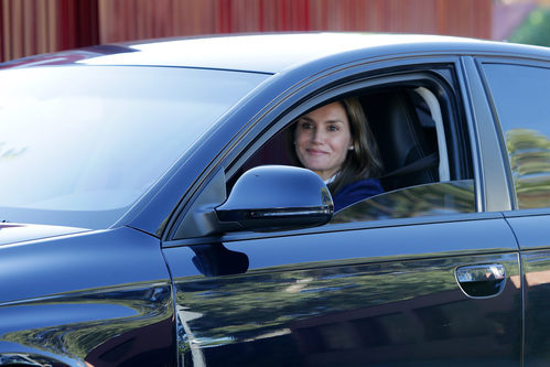 La Reina Letizia saliendo del colegio Santa María de los Rosales tras dejar a sus hijas