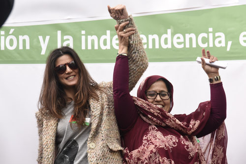 Clara Lago apoyando al pueblo saharaui en Madrid, tras 40 años de lucha del Sáhara por su libertad, junto la delegada del Frente Polisario en España Jira Bulahi