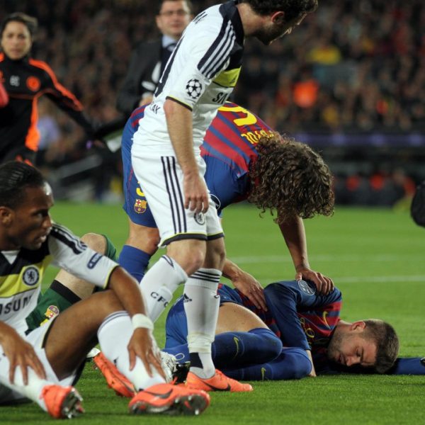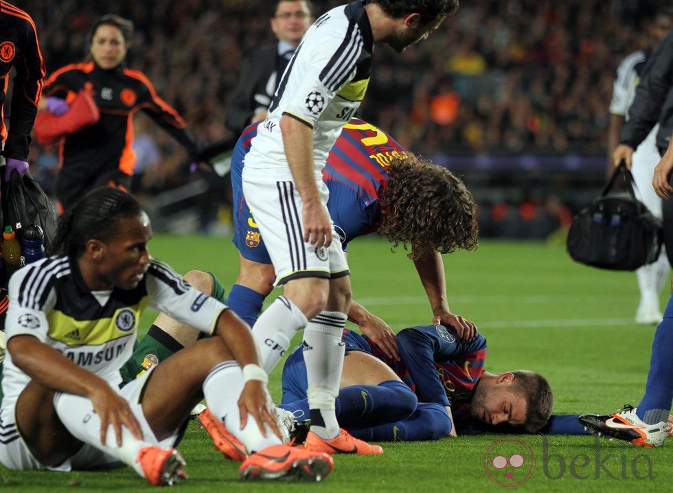 Gerard Piqué derrumbado en el suelo del Camp Nou tras su choque con Víctor Valdés en el partido de Champions contra el Chelsea