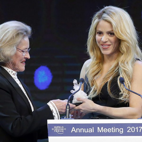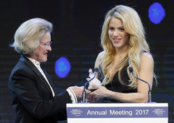 La cantante Shakira recibiendo el Crystal Award de manos de Hilde Schwab en la ceremonia de entrega de los Crystal Awards en el Foro Económico Mundial de Davos.
