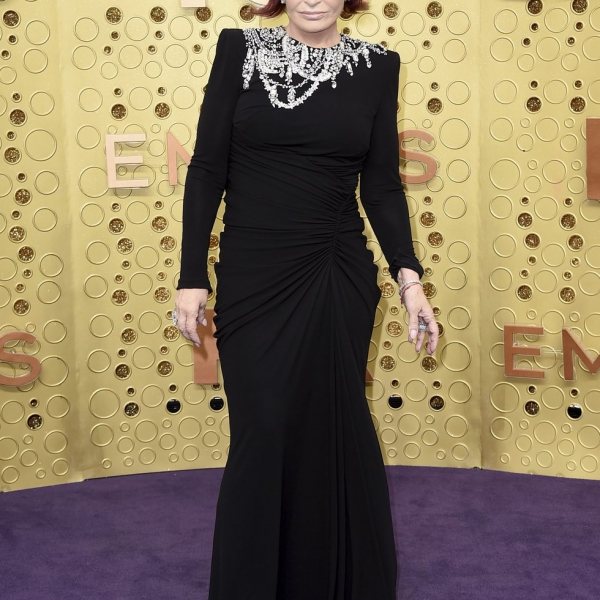Sharon Osbourne en la alfombra roja de los premios Emmy 2019 con un vestido negro. Fue la presentadora de la previa para la televisión estadounidense.