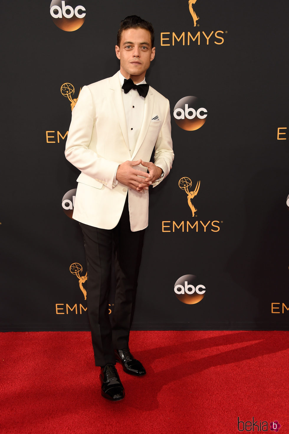 El actor Rami Malek en la alfombra roja de los Premios Emmy 2016 con un esmoquin con chaqueta color blanco roto y pajarita.