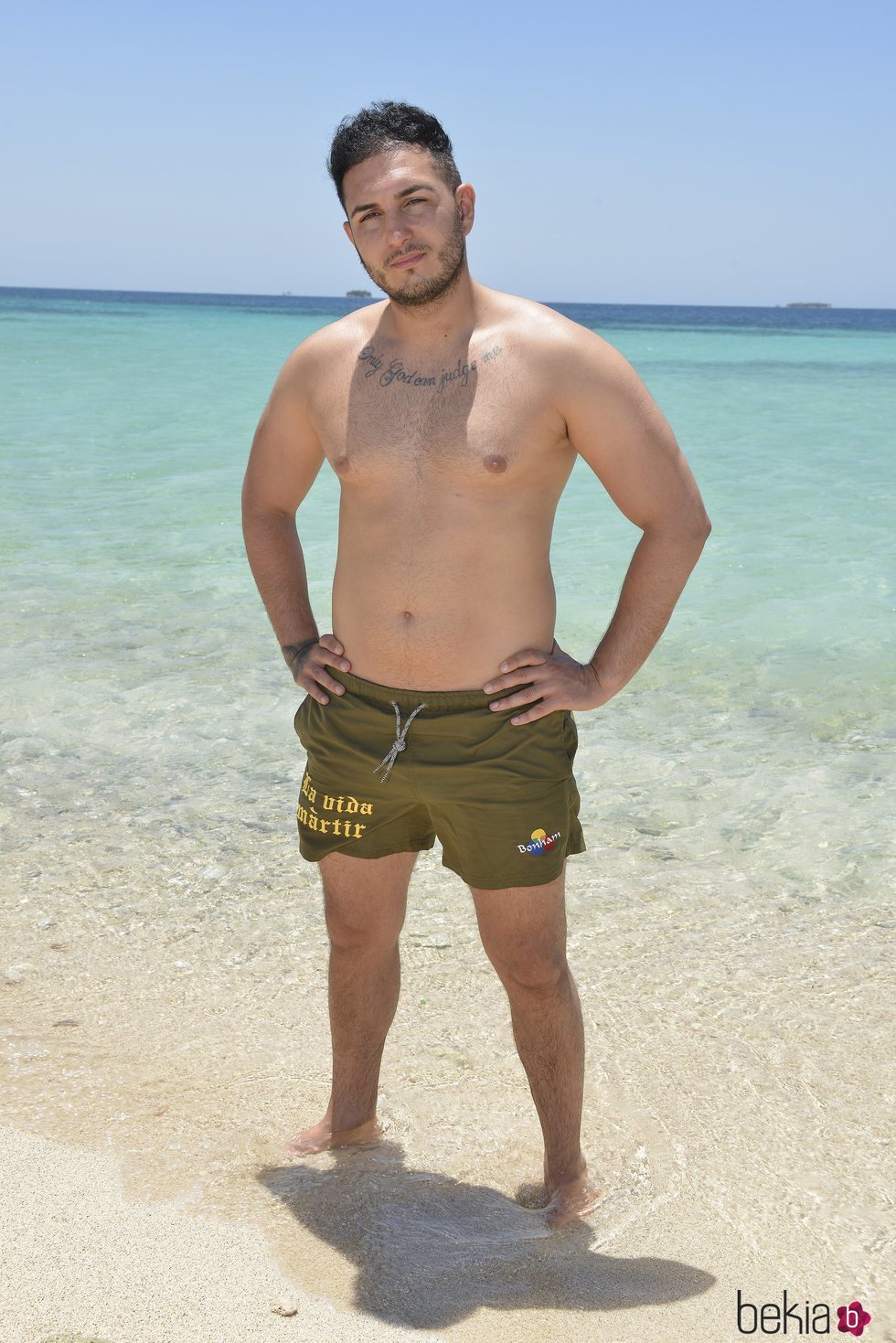 Posado oficial del cantante Omar Montes en la playa con un bañador verde antes de entrar en la isla de Honduras.