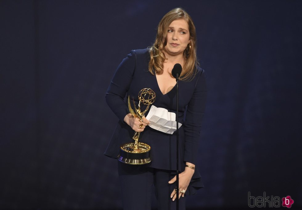 Merritt Wever recogiendo su galardón a 'Mejor actriz de reparto en serie limitada' por 'Goodless' en los Premios Emmy 2018.