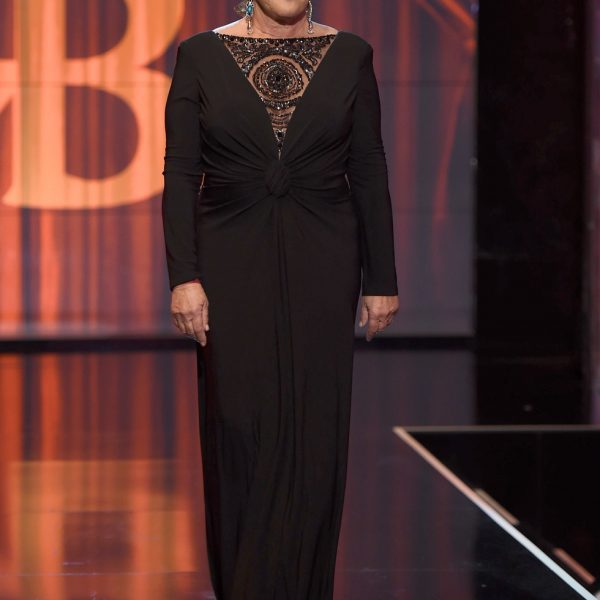 La periodista Chelo García Cortés desfilando en traje de noche en la Sálvame Fashion Week