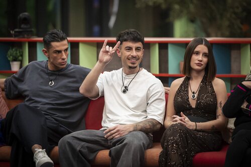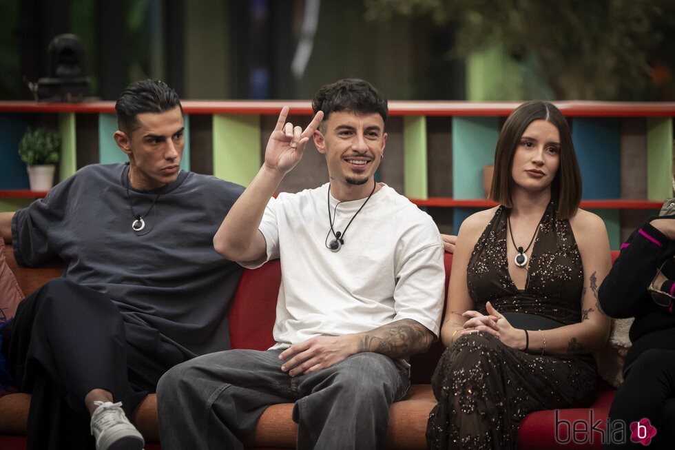 Andrea, Juanpi y Sandra son fotografiados sentados en el sillón durante la tercera gala de 'GH DÚO 4' hablando.