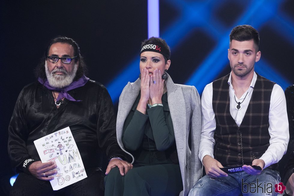 Los concursantes, Juanmi, María Jesús Ruiz y Alejandro Albalá antes de la expulsión en la gala 14 de 'GH DÚO' el jueves 4 de abril.