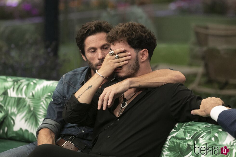 El concursante y cantante Jesús Oviedo, integrante de los Gemeliers, llorando y recibiendo apoyo de Canales Rivera durante la segunda gala de 'Secret Story' celebrada el 16 de septiembre.