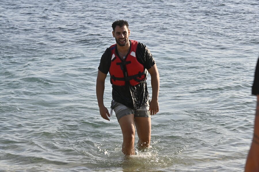 Asraf Beno es fotografiado llegando a la playa después de saltar del helicóptero en la primera gala de 'Supervivientes 2023'.